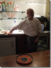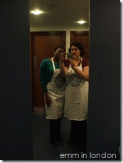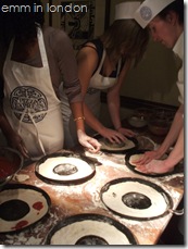 Soon, it was our time to make some pizzas and after rushing off to the the ladies’ for some hand washing and silly-photo-taking, we settled down to work. We were given a ball of dough and then we pulled and kneaded and rolled it until it was time to stretch it into our pans. Then we took out the doughy middles and had to choose between the Mare E Monti or the Verdure toppings. The former has prawns in and I think I might be developing an intolerance for prawns so I chose the latter instead which is a vegetarian option. First I spread a tomato base, then I put rosemary, courgettes, mushrooms, red and yellow peppers, sweet baby onions and some mozzarella cheese before finishing with a light drizzle of garlic oil. Oh, and I, um, accidentally put some chilli powder on too but thankfully did not ruin it!